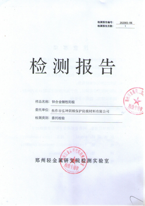鋅合金犧牲陽極檢驗報告Ⅰ